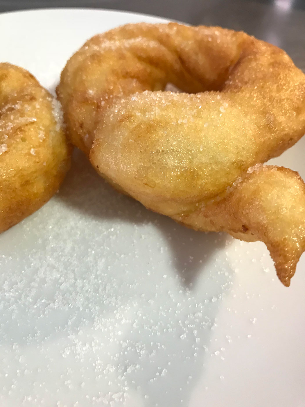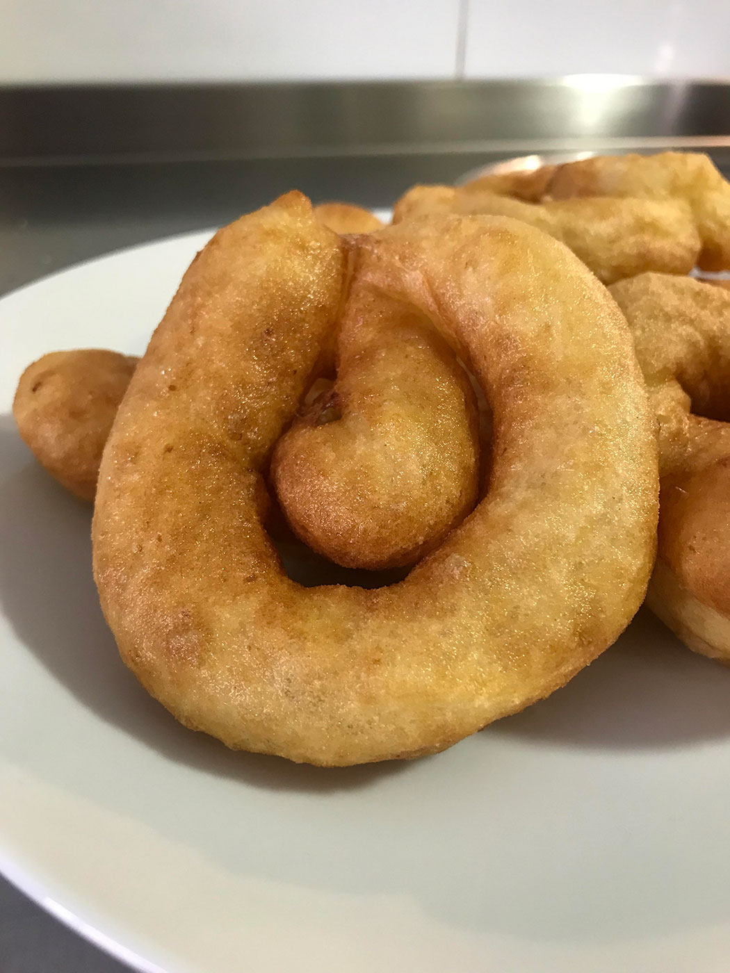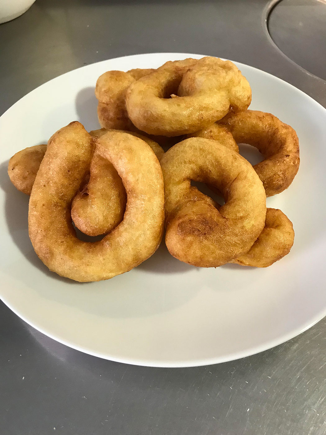 - Pasado este tiempo ponemos en el fuego una sartén con abundante aceite y cuando este bien caliente comenzamos a freír la masa dándole forma de rosca.